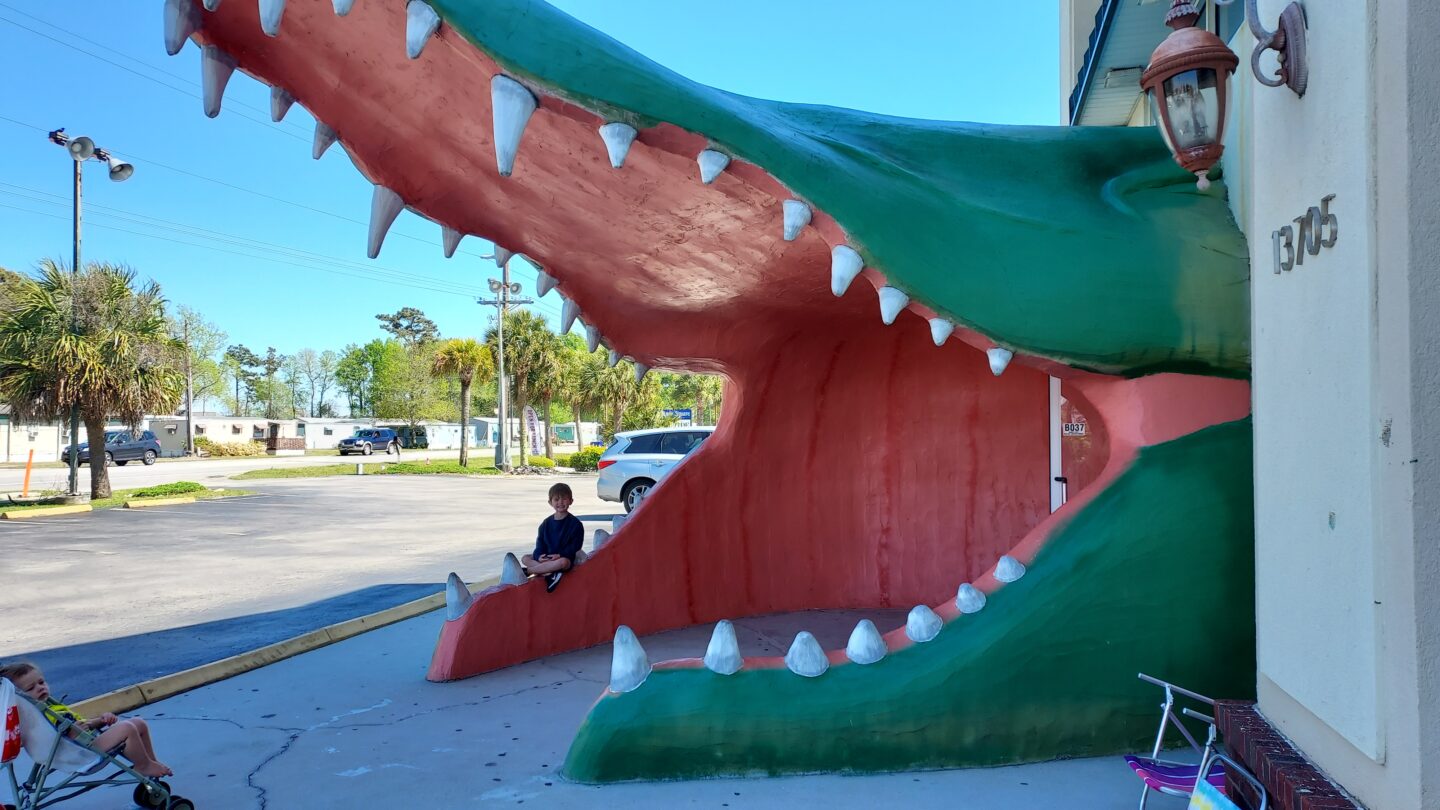 Eventually, we decided to venture back out and made our way to Bargain Beachwear. While this is just your standard souvenir shop, what makes it unique is the rather large alligator at the entrance, whose mouth you have to pass through to enter. Caleb had been so excited all week to get his picture taken with the alligator (I have a picture of him with that same alligator from our last Surf City excursion about 4 years ago).